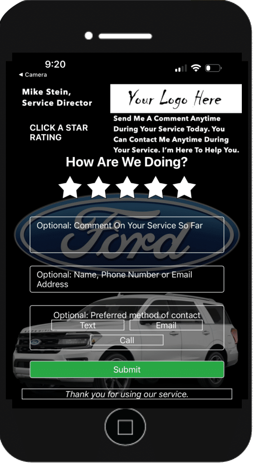 Onsite CSI Tool That Is Uniquely You. Get Customer Real Time Feedback From The Customer While They Are Still In The Dealership Or Store. It's So Good It Has Your Name On It! Hers Is Your Personal Comment Box But It's Mobile Friendly & Delivers Instant Feedback.